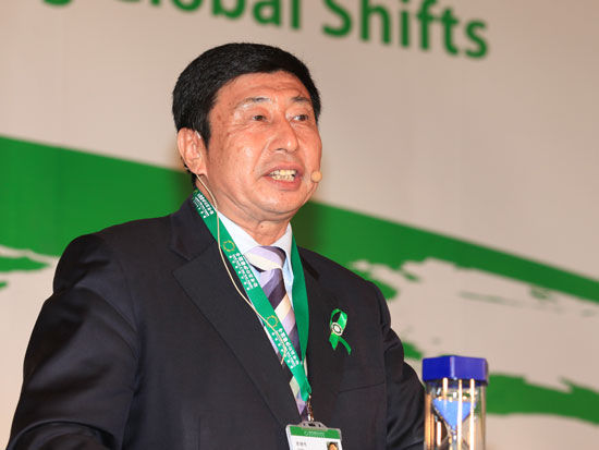 2011年4月21日-22日,由中國(guó)企業(yè)家俱樂(lè)部、道農(nóng)研究院《綠公司》雜志主辦的“2011中國(guó)綠色公司年會(huì)”在青島舉行。圖為青島港集團(tuán)董事局主席、總裁常德傳發(fā)言。
