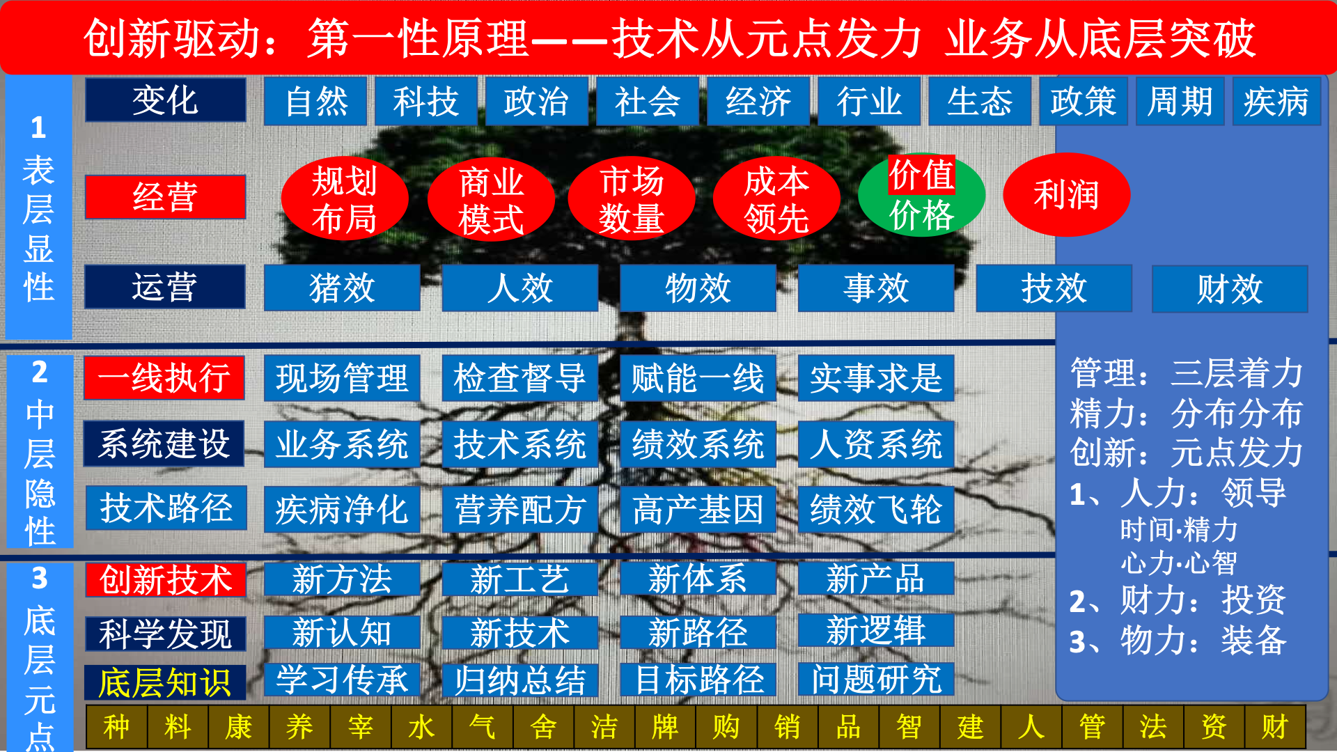 把企業(yè)分三層,表層顯性的經(jīng)營業(yè)績和中層隱性的管理、底層的元點知識。如果企業(yè)僅限于表層的管理,永遠忙碌。企業(yè)的發(fā)展從底層做才是根本,創(chuàng)新驅動遵循“第一性原理”,從技術元點發(fā)力,從業(yè)務底層突破,才能使企業(yè)發(fā)展穩(wěn)定。