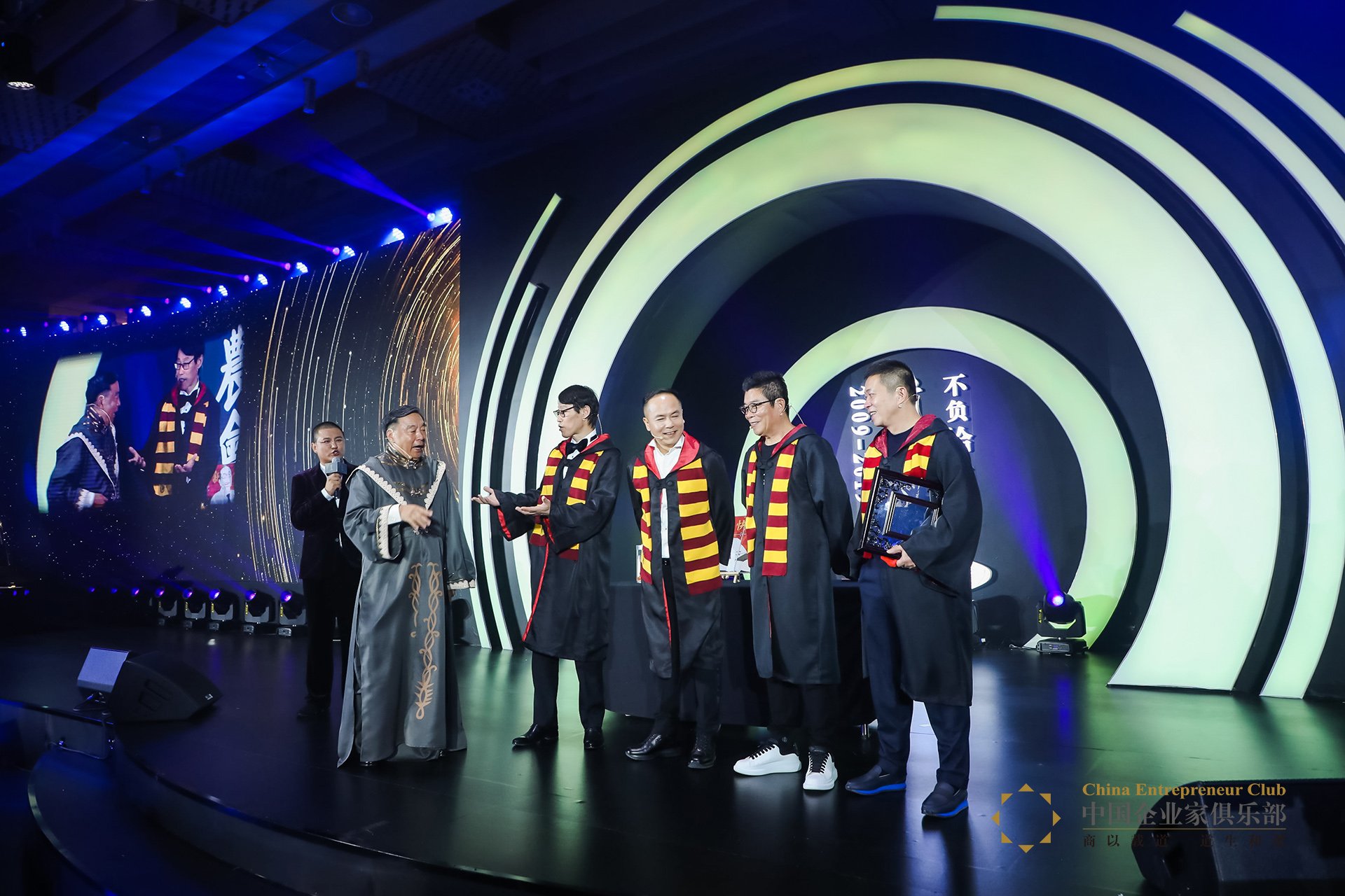 一曲《桃花朵朵開(kāi)》,中國(guó)企業(yè)家俱樂(lè)部9位理事(汪潮涌、張醒生、夏華、黃怒波、王兵、張勇、方洪波、錢(qián)穎一、王均金)與5個(gè)國(guó)家(瑞典、德國(guó)、阿根廷、芬蘭、意大利)駐華大使的出場(chǎng)引來(lái)熱烈的鼓掌。一場(chǎng)集江南才子、牧羊少年、財(cái)神于一體的變裝秀向所有人送上祝福!