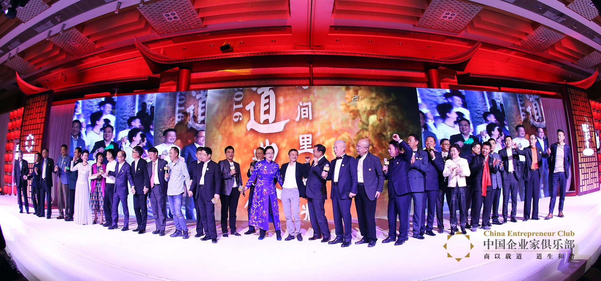 中國(guó)企業(yè)家俱樂(lè)部執(zhí)行理事會(huì)成員馬云、馬蔚華、劉東華、劉永好、郭廣昌及秘書(shū)長(zhǎng)程虹京劇裝扮亮相