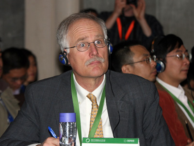 2009年4月22日,由中國企業(yè)家俱樂部和道農(nóng)研究院、《綠公司》雜志主辦的“2009中國綠色公司年會”在北京索菲特大飯店召開。圖為大自然保護協(xié)會(TNC)首席生態(tài)保護執(zhí)行官Bill Ginn在“投資自然:財富新動力”論壇。