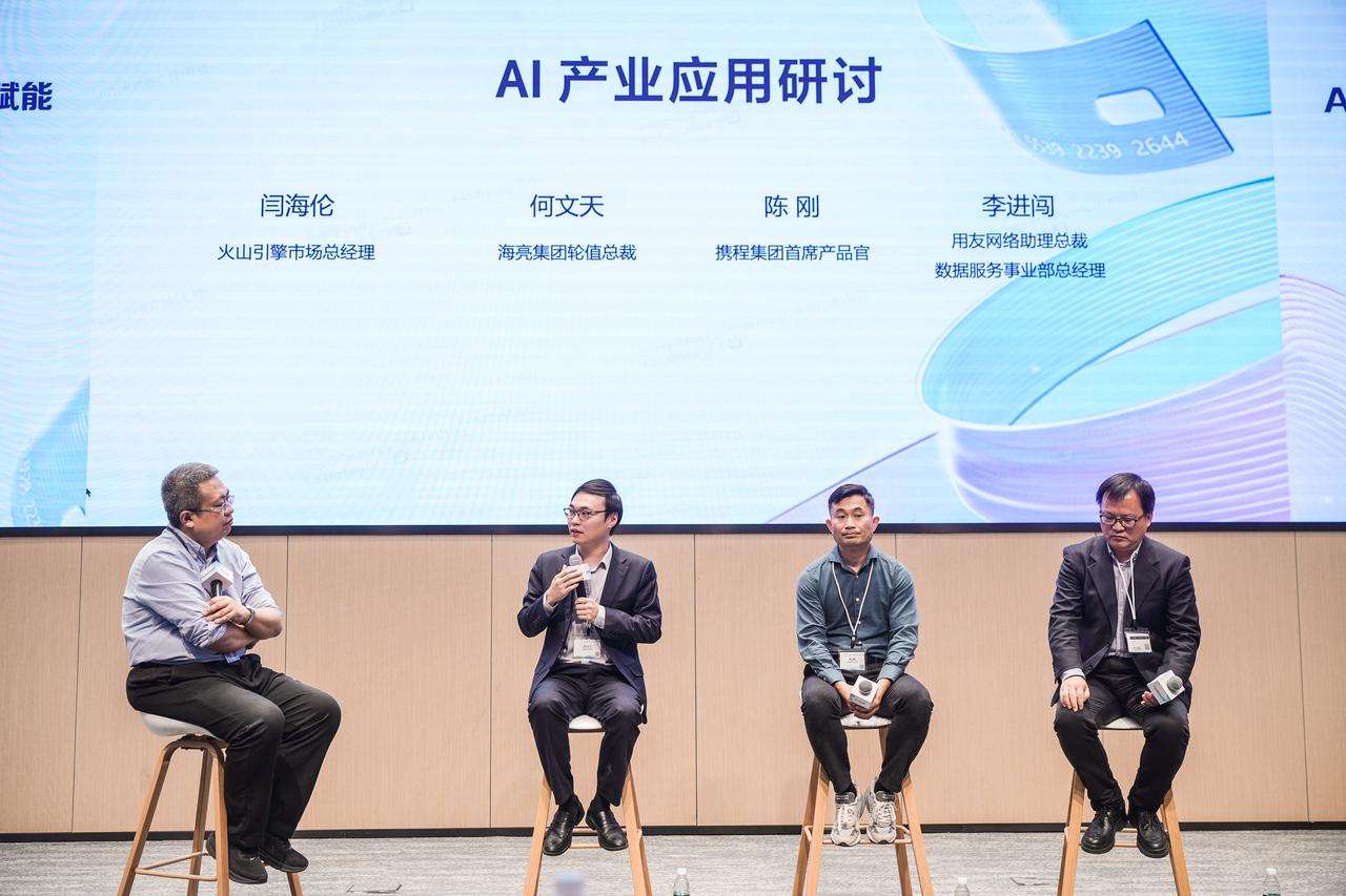在隨后的 AI 產(chǎn)業(yè)應(yīng)用研討環(huán)節(jié),海亮集團(tuán)輪值總裁何文天、攜程集團(tuán)首席產(chǎn)品官陳剛、用友網(wǎng)絡(luò)助理總裁兼數(shù)據(jù)服務(wù)事業(yè)部總經(jīng)理李進(jìn)闖等企業(yè)嘉賓,圍繞 “企業(yè)大模型應(yīng)用場景”“企業(yè) AI 落地效果評估”“痛點與避坑經(jīng)驗” 等議題展開深入交流,火山引擎市場總經(jīng)理閆海倫主持研討并引導(dǎo)交流方向。